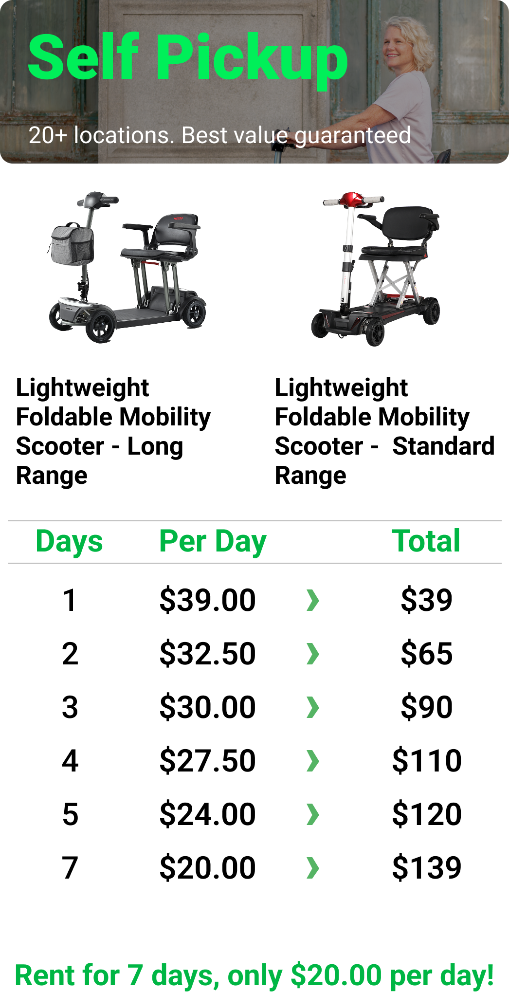 Browse our range of lightweight mobility scooters and select the one that suits your needs. Whether it’s a short-term rental or long-term use, we have the perfect ride for you.